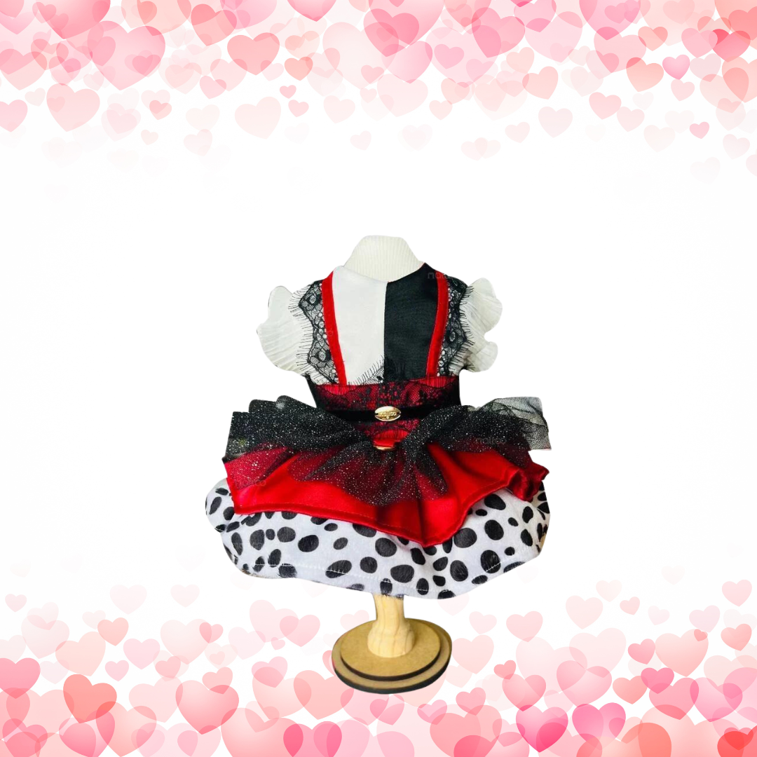 Vestido de luxo com três camadas de saia. Detalhes riquíssimos em renda chantilly e fitas de veludo, Forro acetinado para não embolar os pêlos. Fechamento em velcro. Estampa de dálmata em tecido pelúcia. Possui jóia dourada para engate da guia.